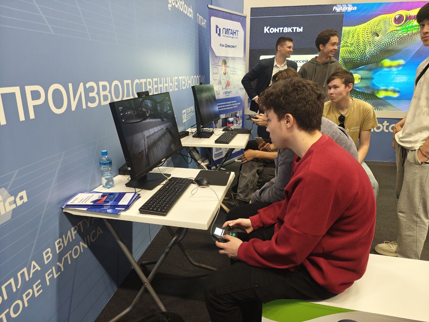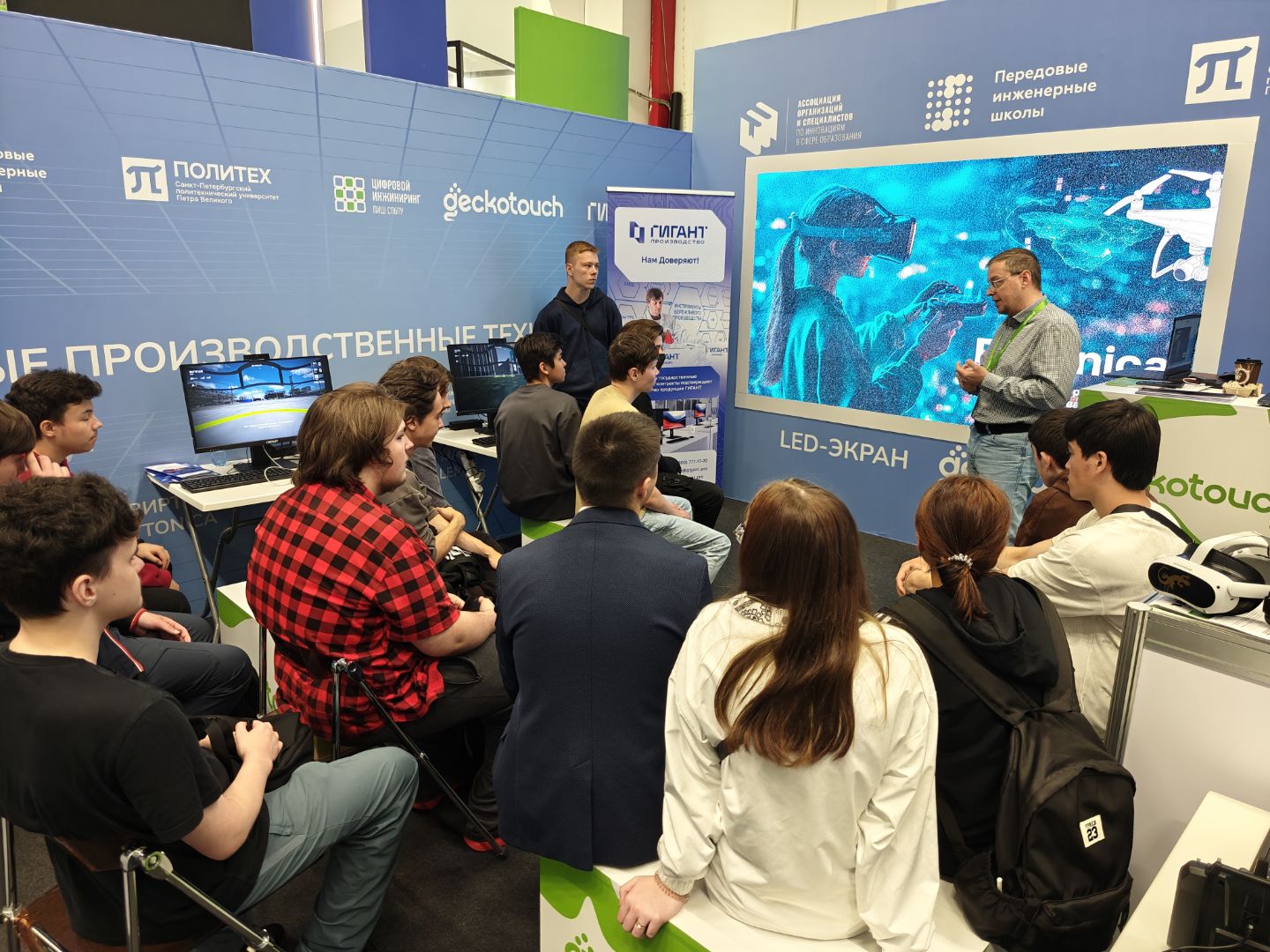 ГИГАНТ Производство находился на совместном стенде с компанией Flytonica, предлагающей VR-решения для обучения навыкам пилотирования БПЛА для образовательных учреждений. ГИГАНТ, Flytonica, Geckotouch и другие участники мероприятия организовали комфортное технологичное пространство, где юные гости форума смогли на практике оценить возможности отечественных решений для цифровизации обучения.